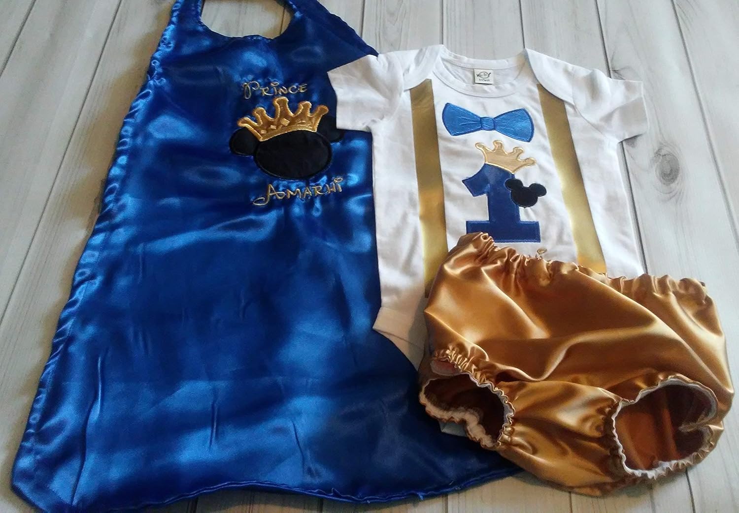 Celebrate your little one’s big day in magical style with this custom Mickey-inspired birthday outfit, handcrafted for milestone memories and themed photo shoots. The white onesie features a bow tie, birthday number, Mickey head, crown, and faux suspenders—all professionally appliquéd for lasting quality. The royal blue satin cape adds a regal touch, embroidered with a Mickey crown and your choice of “KING” or “PRINCE” plus your child’s name. It fastens around the neck with snaps for easy wear and comfort. The matching gold satin diaper cover completes the look, making this set perfect for smash cake photos, party entrances, or keepsake portraits. Each piece is made to order with care and attention to detail.