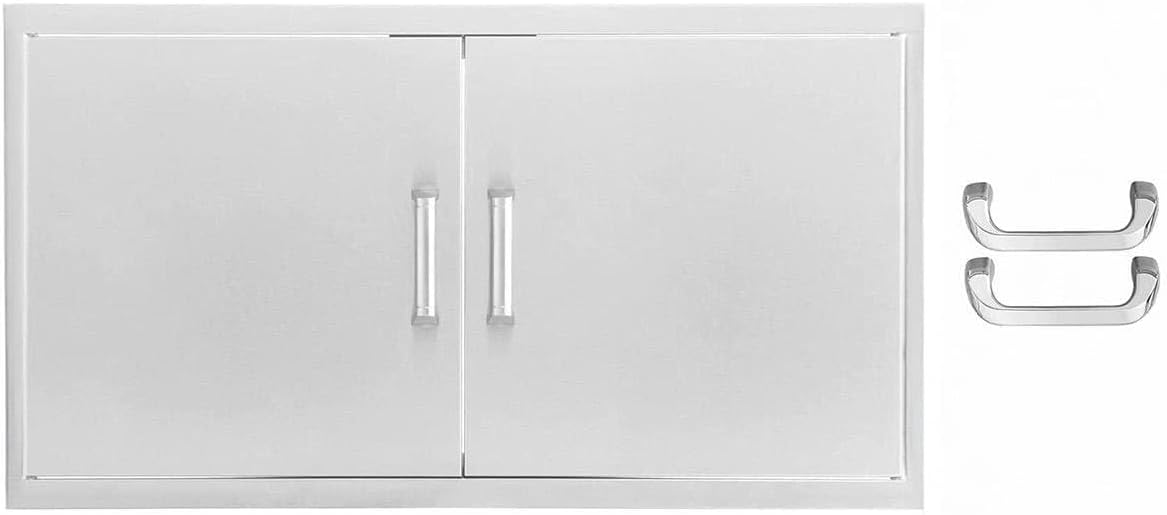 40-in Contempo/Traditional Stainless Steel Double Access Door by BBQGuys Signature - BBQ-AD40. BBQ-AD40. BBQ & Outdoor Kitchen Access Doors. This BBQGuys Signature 40-in stainless steel double access door is constructed with a 20 gauge, 304 grade stainless steel frame and number 4 brushed finish. This unit is flush mounted for a streamlined appearance. An access door is the perfect outdoor kitchen accessory for any outdoor BBQ island, providing storage space and access to the underside of grills and side burners. BBQGuys Signature outdoor kitchen components are designed without a logo, so you can pair them with any brand of grill or outdoor kitchen appliance. Traditional and contemporary-style handles are both included, and they require installation on the double access door. Product does not include installation hardware or instructions. Door Opening Dimensions: 33 1/4 W X 17 7/8 H....