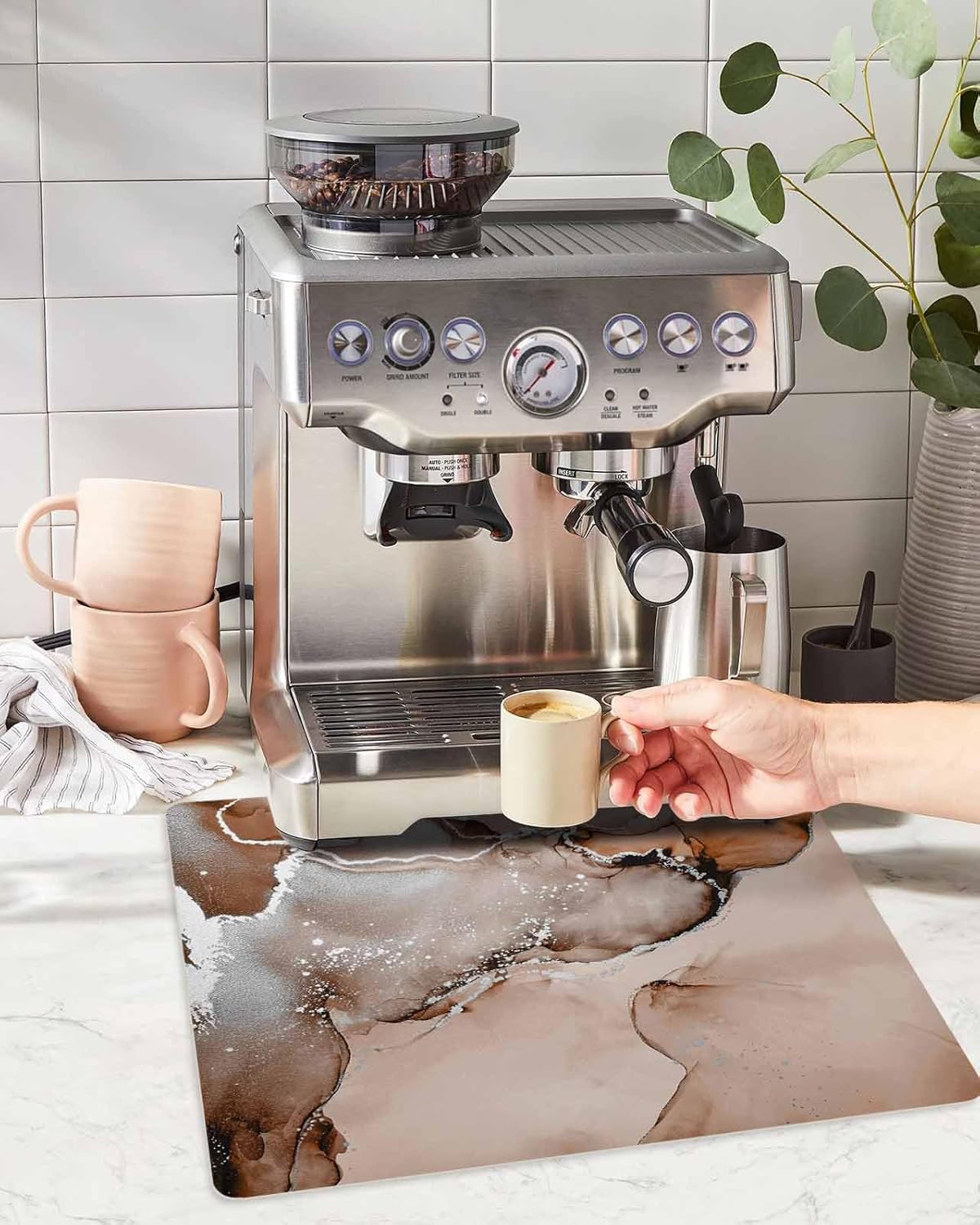 QueenKer Coffee Mat - Coffee bar mat accessories for countertop Quick Dry Coffee Mat Size: 12x20 inches 16x18 inches 16x24 inches 18x24 inches 18x28 inches Thickness: 0.1 inch Material: PU Backing: Rubber Use occasion: Kitchen countertop, Coffee maker mat, Espresso machine accessories, Coffee station, Water dispensers, Mixers, Ice cream machines, Dish washing racks, Dinner plates, Tableware, food pad for pets. Serviceable rubber is of tear resistance and wear resistance,it can always well protect your coffee countertops Unique design coffee mats for countertop: Unique stylish pattern design is a perfect gift ideal for housewarming, birthday, family gathering, wedding, anniversary, Thanksgiving, Halloween, Christmas. Easy to Clean & Store: Keep it clean by simply wiping or rinsing,and let it air dry naturally. DO NOT BLEACH. After cleaning, place it in a well-ventilated area to fully dry It can be easily rolled up or folded, so it is easy to store Warm Tips: The colors may have different as the difference display, please understand However, please note that there may be a slight rubber smell when you first use it. If you are allergic to rubber smells, we do not recommend purchasing it If you have any questions about our quick dry coffee maker mat, please contact us and we will solve your problem within 24 hours