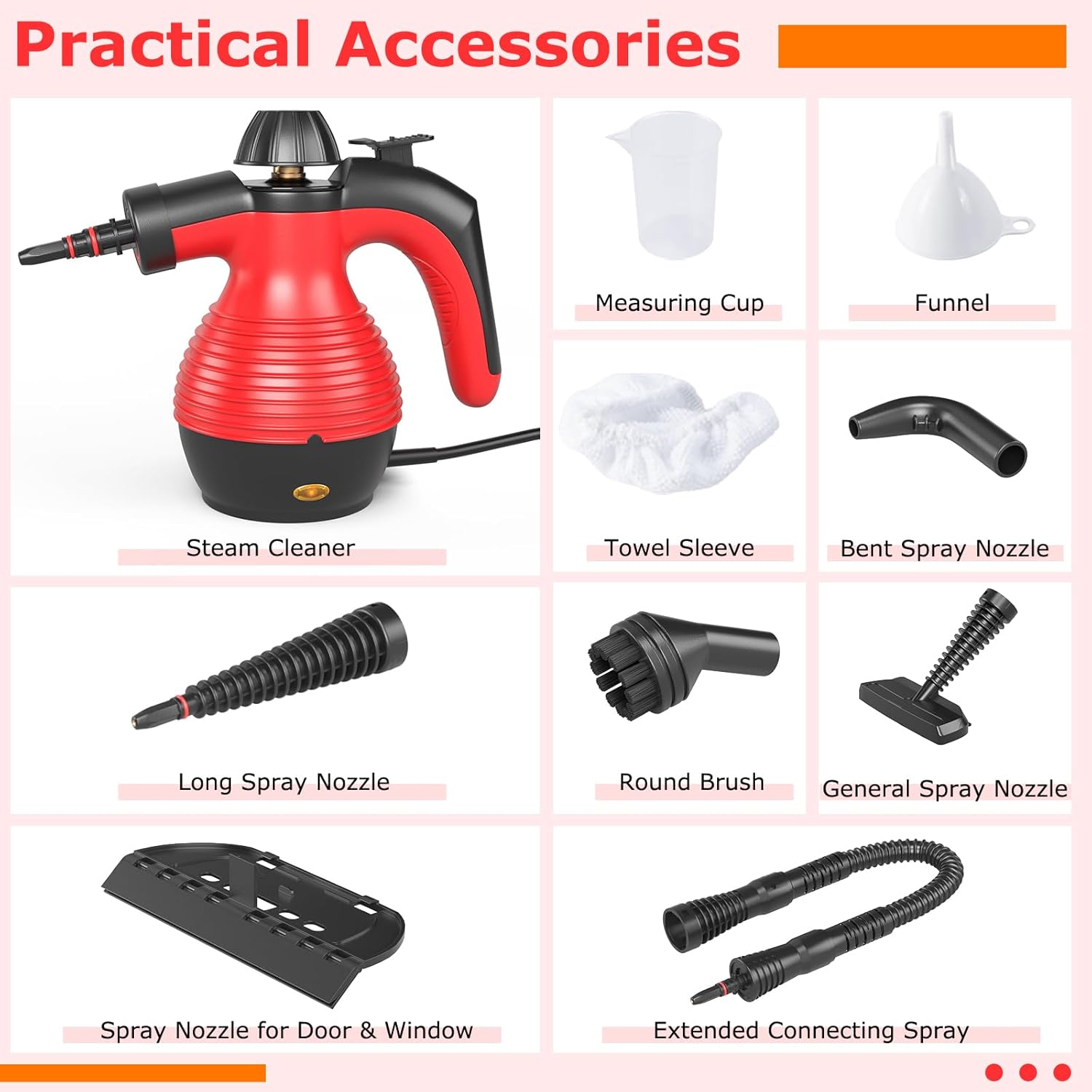Description:Discover a more efficient way to clean with this handheld steam cleaner. It is a powerful 1050W portable cleaning tool that designed to tackle various cleaning tasks around your home. Equipped with a 12 oz/350 ml water tank, this steamer generates a robust 3 bar steam pressure, reaching a maximum temperature of 275 ºF. The heating time of just 3-5 minutes means you can start your cleaning tasks almost immediately. Besides, 9 accessories and rotating steam nozzle allow you to effortlessly cut through grease, grime, and dirt on floors, windows, and other surfaces. For reliable use, the steamer is designed with a safety lock and cap to prevent accidental steam discharge. Handle tough, out-of-the-way cleaning jobs with ease, thanks to the long power cord. Features:1050W high power steam cleaner ensures deep and efficient cleaning An effective cleaning tool with 3bar steam pressure and 275 ºF max temperature 350mL/12 oz large capacity water tank improves cleaning efficiency9 practical accessories are perfect for tackling different cleaning tasksMulti-purpose steamer for corner, bathroom, car, upholstery, bed or mirror360° rotating steam nozzle allows for precise steam applicationSafety lock prevents scalding and potential accidents With safety cap, you can tighten the lid to avoid steam leakages Indicator light will auto off when heating ends9.5ft/290cm long power cord is easy to access hard-to-reach areas Specifications:Specifications:Color: Blue/Red/YellowMaterial: PPOverall Dimensions: 10.5" x 5.5" x 8.5"/28 x 14 x 21.5 cm (L x W x H)Net Weight: 20 lbs/9 kgTank Capacity: 12 oz/350 mlSuggest Water Capacity: 8.5 oz/250 mlInterior Temperature: 275 ºFFuse Temperature: 332.6°FHeating Time: 3-5 minutesRated Power: 900 W - 1050 WSteam Pressure: 3barRated Power Supply: 110V, 60HzWhy You Choose Our Handheld Steam Cleaner?√Powerful and deep cleaning for various surfaces√Complete accessories suit a variety of cleaning needsPackage Includes:1 x Steam Cleaner1 x Extended Connecting Spray Nozzle1 x General Spray Nozzle1 x Funnel1 x Tower Sleeve1 x Measuring Cup1 x Round Brush Nozzle1 x Long Spray Nozzle1 x Bent Spray Nozzle1 x Spray Nozzle for Door/Window1 x Instructions