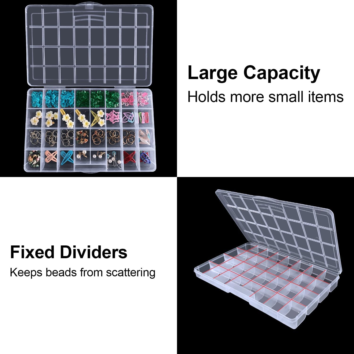 Organize your small items effortlessly with this set of bead organizer boxes, designed for convenience and durability. Each box features 32 fixed compartments, ensuring your supplies stay neatly arranged without shifting or mixing up. The clear design allows you to quickly identify the contents at a glance, making it ideal for keeping your workspace tidy and efficient. With outer dimensions of 13.7"L x 8.6"W x 1.4"H and compartment dimensions of 2.1"L x 1.7"W x 1.2"H, these boxes provide ample storage space while maintaining a compact form that's easy to handle.The fixed divider design keeps each compartment securely in place, preventing small items from shifting during handling or transport. This thoughtful feature makes the box an excellent choice as a bead holder organizer or bead organizer box, ensuring all your supplies remain sorted and ready to use. Versatility is another key feature of this organizer. These boxes are perfect for storing and organizing a wide variety of small items, including beads, rings, earrings, thread, small stones, art DIY crafts, nails, fish hooks, bait, screws, bolts, nuts, and more. Their multifunctional nature also makes them ideal as jewelry making organizers, rock collection boxes, or bead box organizers for various hobbies and projects.Designed with portability in mind, the lightweight boxes are easy to carry, making them suitable for use at home, on the go, or during crafting classes and DIY projects. The transparent design saves time by letting you see the contents without opening the lid, ensuring effortless organization and quick access. Whether you’re an enthusiast or a professional, these bead storage containers offer a practical, durable, and versatile storage solution for all your small items.