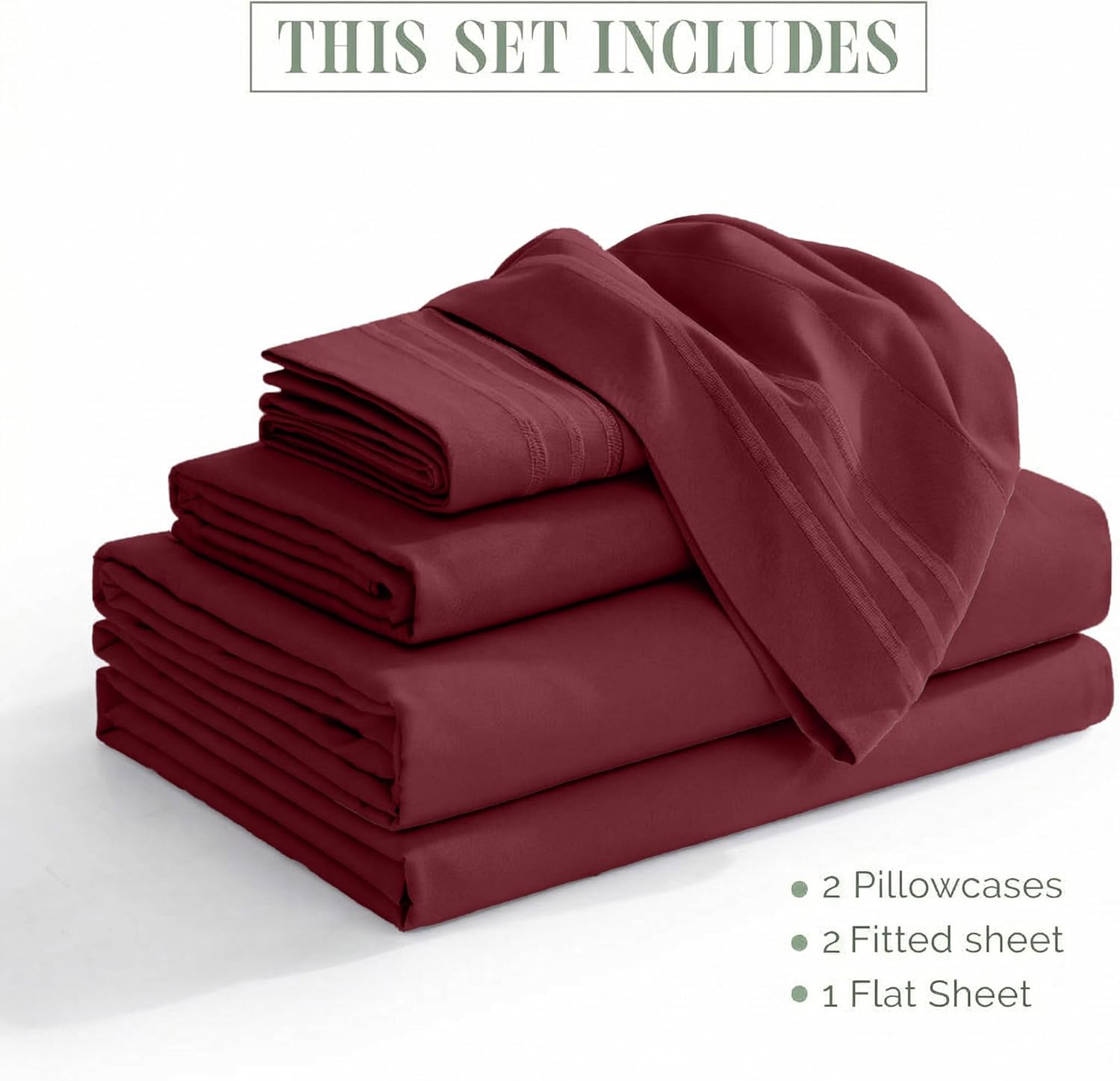 Experience luxury like you've never felt before. Sheets that feel almost hedonistic, this sumptuous set is going to bring your dreams to a whole new level. Slip between the covers and let yourself wallow in the decadence that this bedding offers. Add in delightfully soft, ultra-plush pillowcase, and you'll truly feel pampered. These bed sheets are crafted from incredible, wrinkle-free microfiber and features an elegant Three-Line embroidery on pillowcases. It's available in a variety of beautiful colors, and no matter which one you choose, when morning comes and the alarm clock goes off, you just might be tempted to crawl farther beneath these covers and try to pick up where your dreams left off. Care Instructions: Machine wash Cold, Gentle Cycle. Do not bleach. Tumble dry low