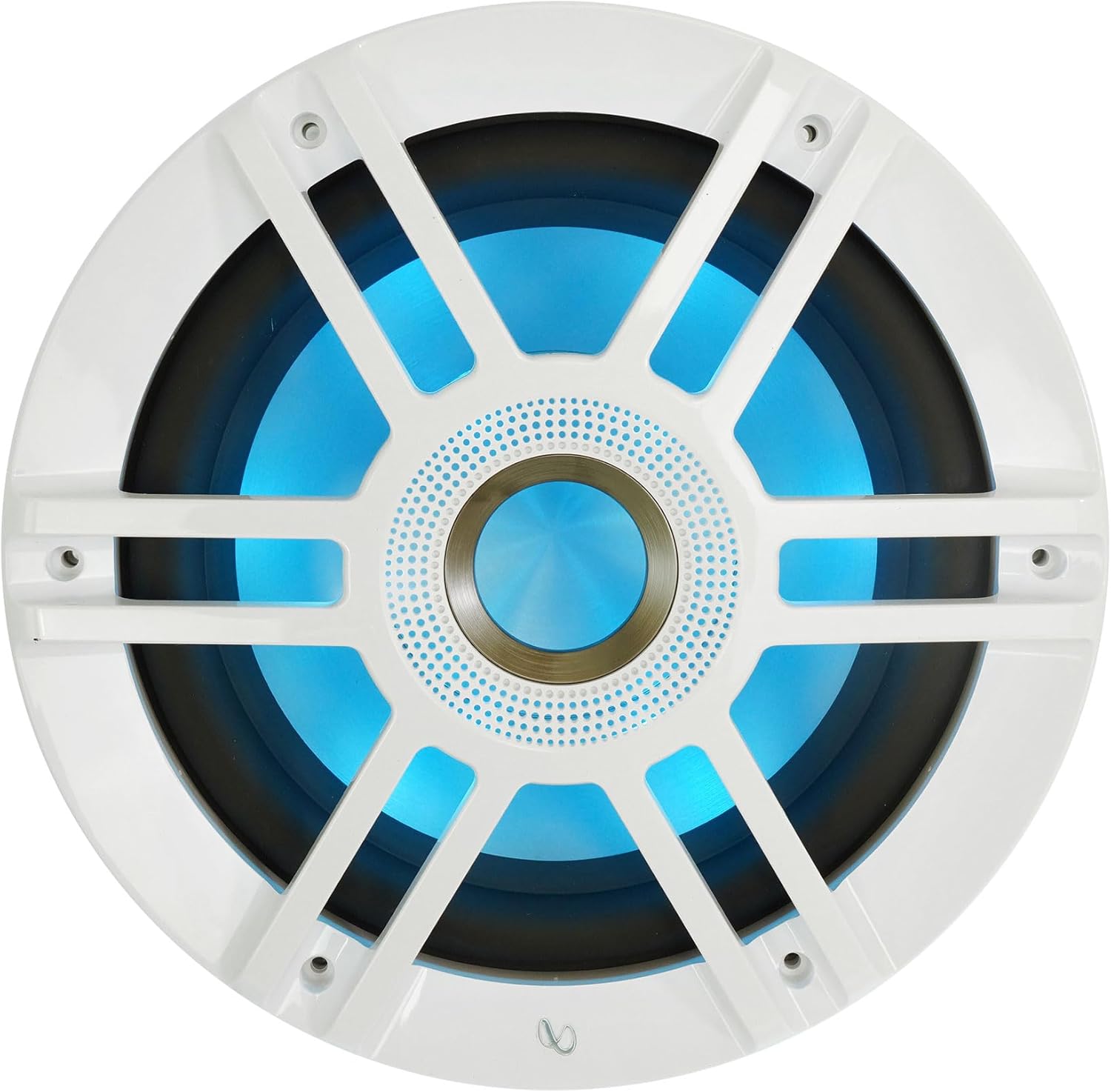 The Infinity KAPPA 1010M pair is designed for boat and watercraft owners who want marine-ready bass, flexible system setup, and built-in RGB lighting. These 10-inch marine subwoofers combine purpose-built weather resistance with Infinity audio engineering to deliver reliable low-frequency performance on the water.Each KAPPA 1010M handles 300 Watts RMS and 900 Watts peak power for strong marine bass outputSSI switch-selectable impedance lets you choose 2-ohm or 4-ohm operation for easier system matchingPlus One polypropylene woofer cones provide increased cone area for enhanced low-frequency response and sensitivityBuilt with a cast polymer basket, sealed magnet, and rubber surround for durability in marine conditionsUV-resistant, marine-grade weather-resistant design is rated IPX3 overall and IPX5 from the frontRGB perimeter illumination displays seven colors out of the box, with expanded color options through an external controllerSpecifications include 89 dB sensitivity, 20 - 2kHz frequency response, and a 2-inch (49.5 mm) voice coilTested to withstand 300 hours of salt spray exposure for added confidence in harsh environmentsThis Infinity marine subwoofer set is a practical fit for marine audio systems that need durability, flexible impedance selection, and visual appeal. Whether used for daily cruising, relaxing at anchor, or active time on the water, the KAPPA 1010M pair brings bass performance together with RGB perimeter lighting and construction made for sun, moisture, and salt exposure.