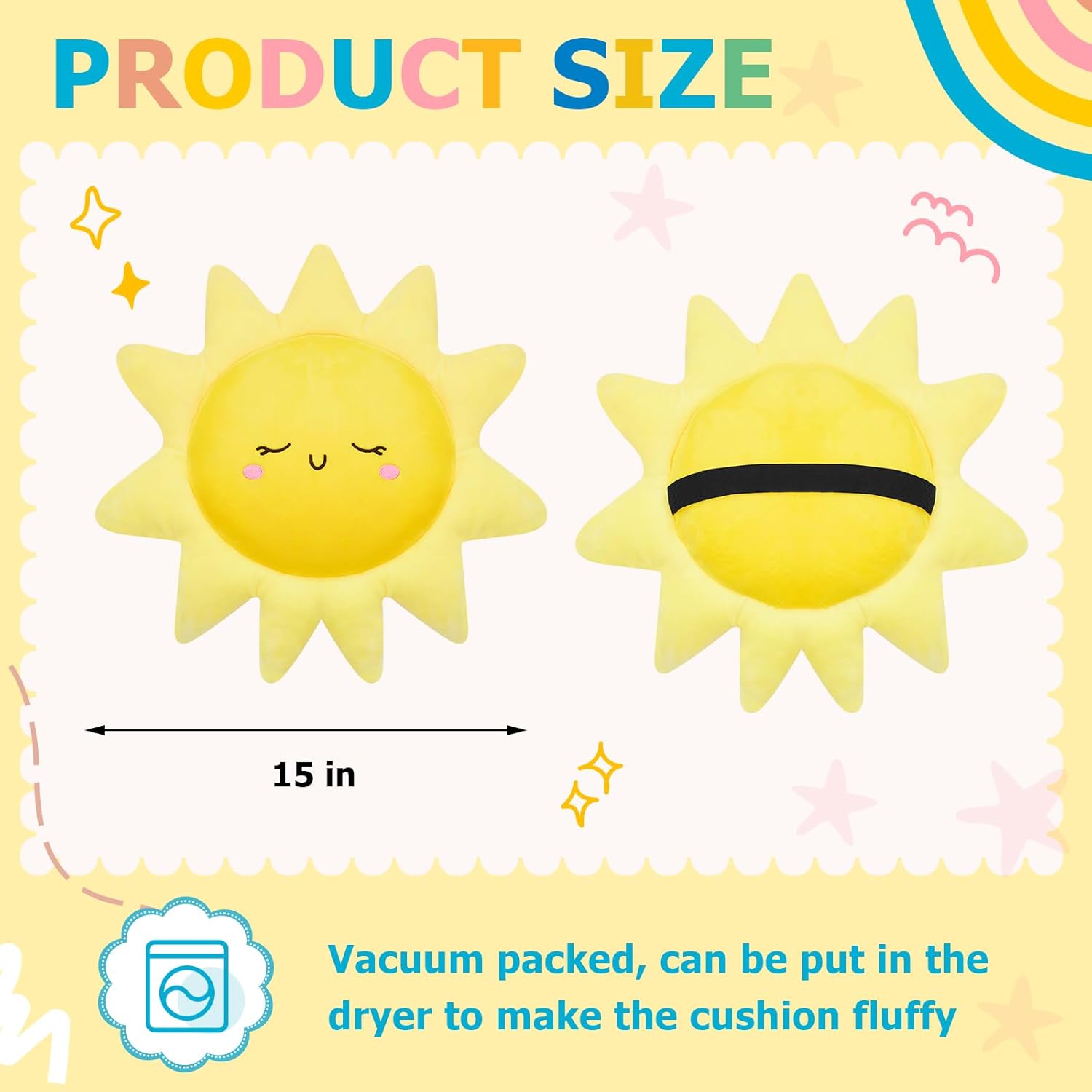 Features: Easy care and maintenance Our cushions are vacuum compressed for safe and compact shipping. Upon receipt, they can quickly return to their intended form, either naturally over time or by placing them in a dryer. This simple maintenance makes caring for your cushions hassle-free. Secure and adjustable Featuring an elastic band design, these cushions can be easily secured to the back of chairs or applied as car pillows. This adaptable feature ensures that no slippage occurs, keeping your cushion in place as you move about your daily activities for consistent support and comfort. Specifications: Material: plush Color: yellow Size: 40 cm Package includes: 6 x Sun shaped floor cushions for classroom Notes: Manual measurement, please allow slight errors on size. The color may exist a slight difference due to different screen displays.