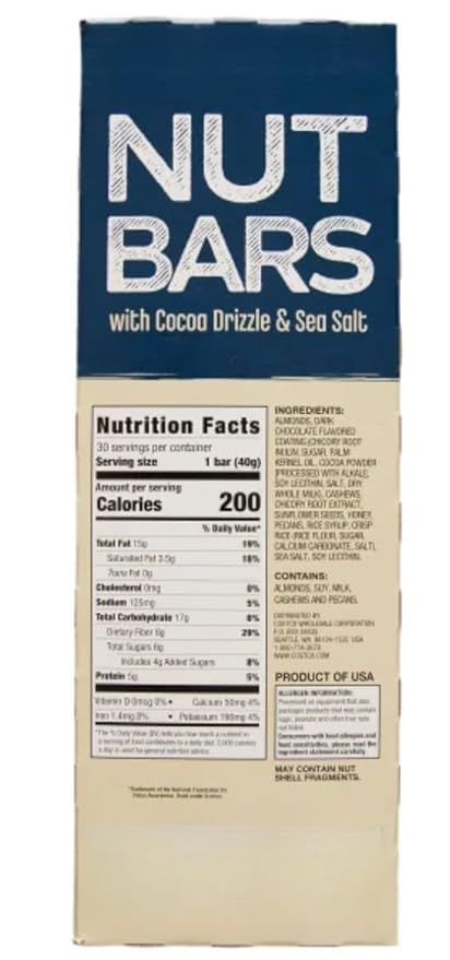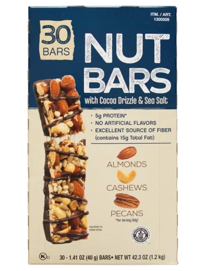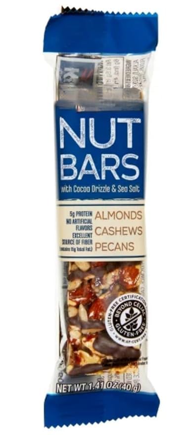 Satisfy your cravings with a smart and flavorful snack bar made from whole almonds, cashews, and pecans — topped with a light cocoa drizzle and a pinch of sea salt. Each bar delivers 5g of protein and is an excellent source of fiber, making it a satisfying option between meals or before workouts. With no artificial flavors and certified gluten free, these 30 individually wrapped bars are ideal for work, school, or keeping stocked in your pantry. Kosher certified and made in the USA, this snack combines clean ingredients, great taste, and real nutrition in every bite.