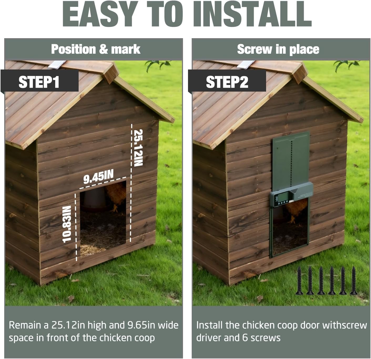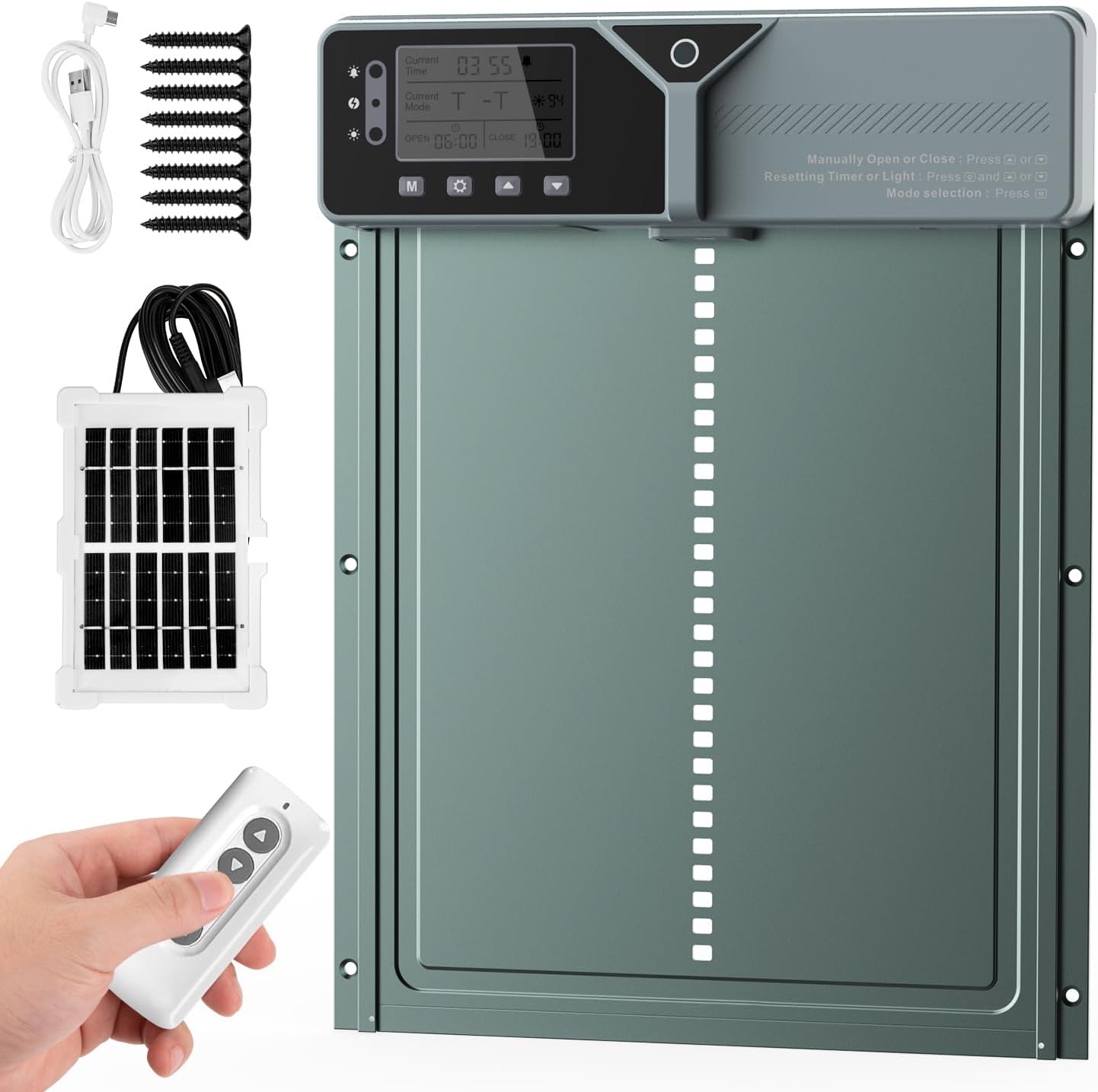 | Included Components | 1 Chicken Coop Door, 1 Screwdriver, 1 Solar Panel, 1 USB-C Charge Cable, 8 screws |