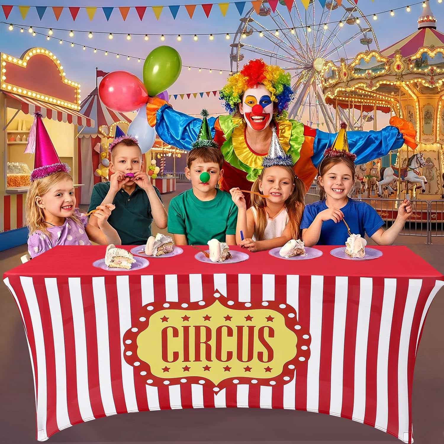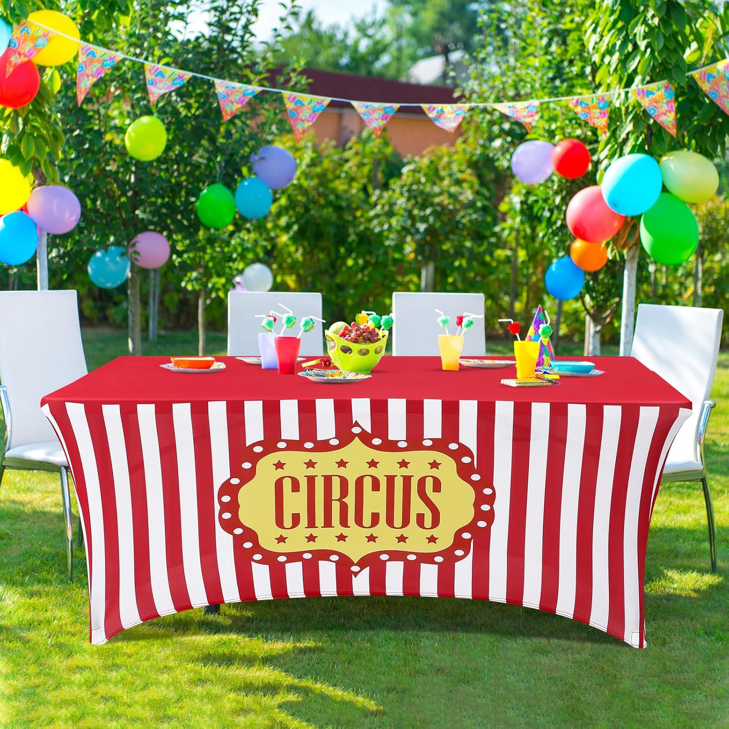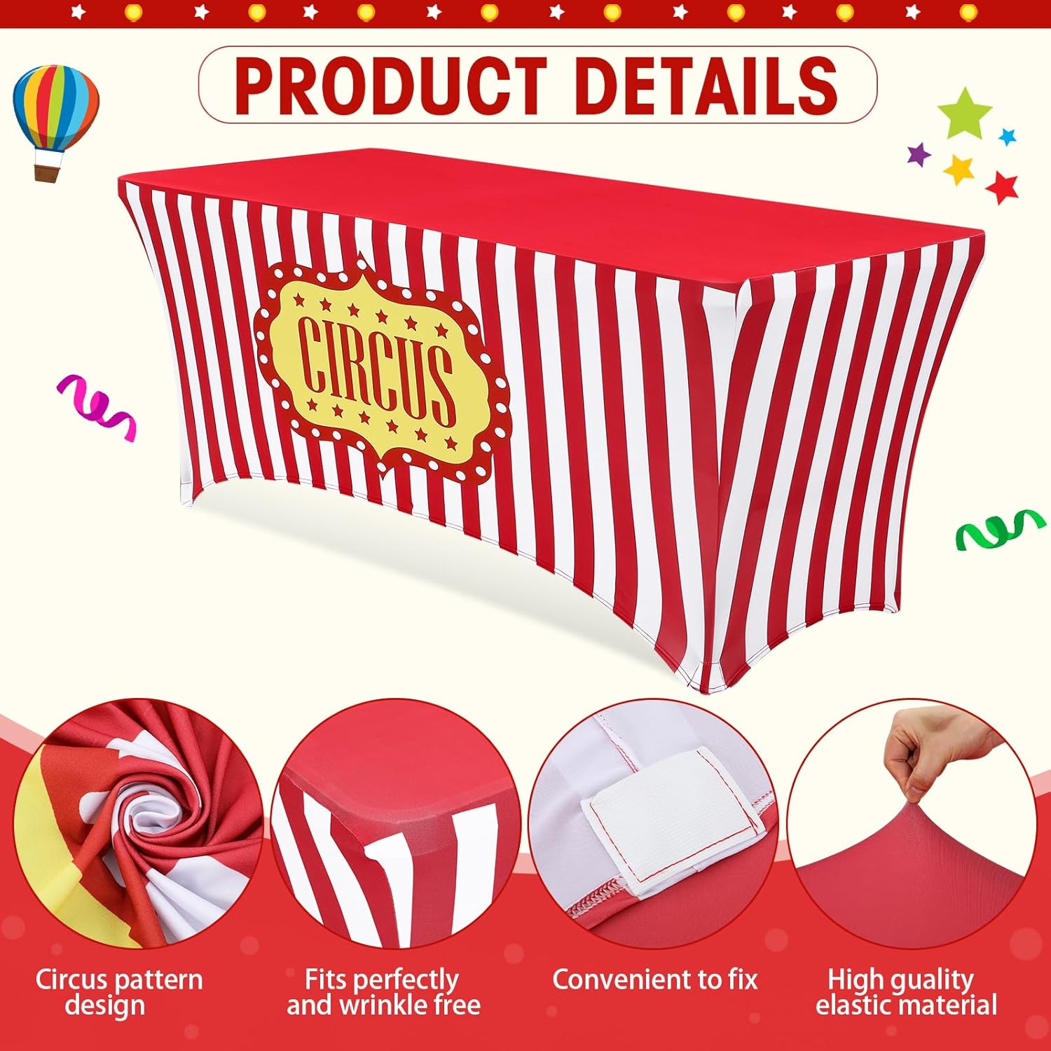 Product Features: Our carnival red and white striped tablecloth is made from premium spandex fabric. This stretchy fabric is durable and retains its shape and elasticity even after multiple uses. Our carnival tablecloth is made from 4 way stretch spandex fabric and features table leg covers for a snug fit on the tabletop, creating a stylish and professional look that enhances the atmosphere of any themed party. Specifications: Material: spandex Colors: red, white Size: 6 feet (fits tables up to 72 x 30 x 30 inches) Package Includes: 1 x Red and white striped tablecloth Notes: Due to manual measurement, there may be slight size differences. Due to different screen displays, colors may vary slightly Manual measurement, please allow slight errors on size. The color may exist a slight difference due to different screen displays