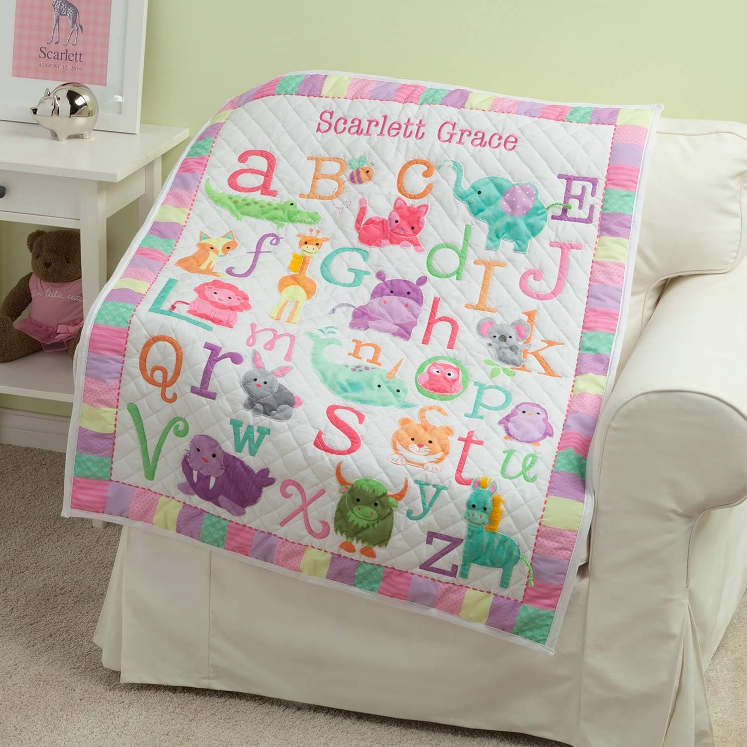 Add some personalized style to her nursery with our exclusive personalized quilt. She will love the adorable animals and colorful ABC's on this beautiful personalized quilt. This quilt features amazing embellishments like yarn tails, yarn patchwork, and soft textures. We make it one-of-a-kind by personalizing the top with her name. The personalization is done with embroidery in matching pink thread color. Personalized Planet is a leading online retailer specializing in personalized gifts for special occasions, holidays, and celebrations. Our wide selection of customized productions makes excellent gift ideas for birthdays, Christmas, Mother's Day, Father's Day, Grandparent gifts, and more. We also carry a large selection of licensed children's products for popular brands such as Paw Patrol, Peppa Pig, Wild Kratts, JoJo Siwa, Monster Jam, and others. Our officially licensed products are available in products such as kids' beach towels, pillowcases, apparel, backpacks, room décor, and more. Personalized Planet provides the opportunity to give a truly unique and memorable gift!