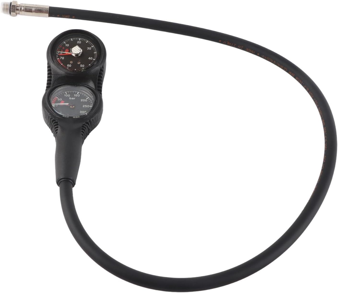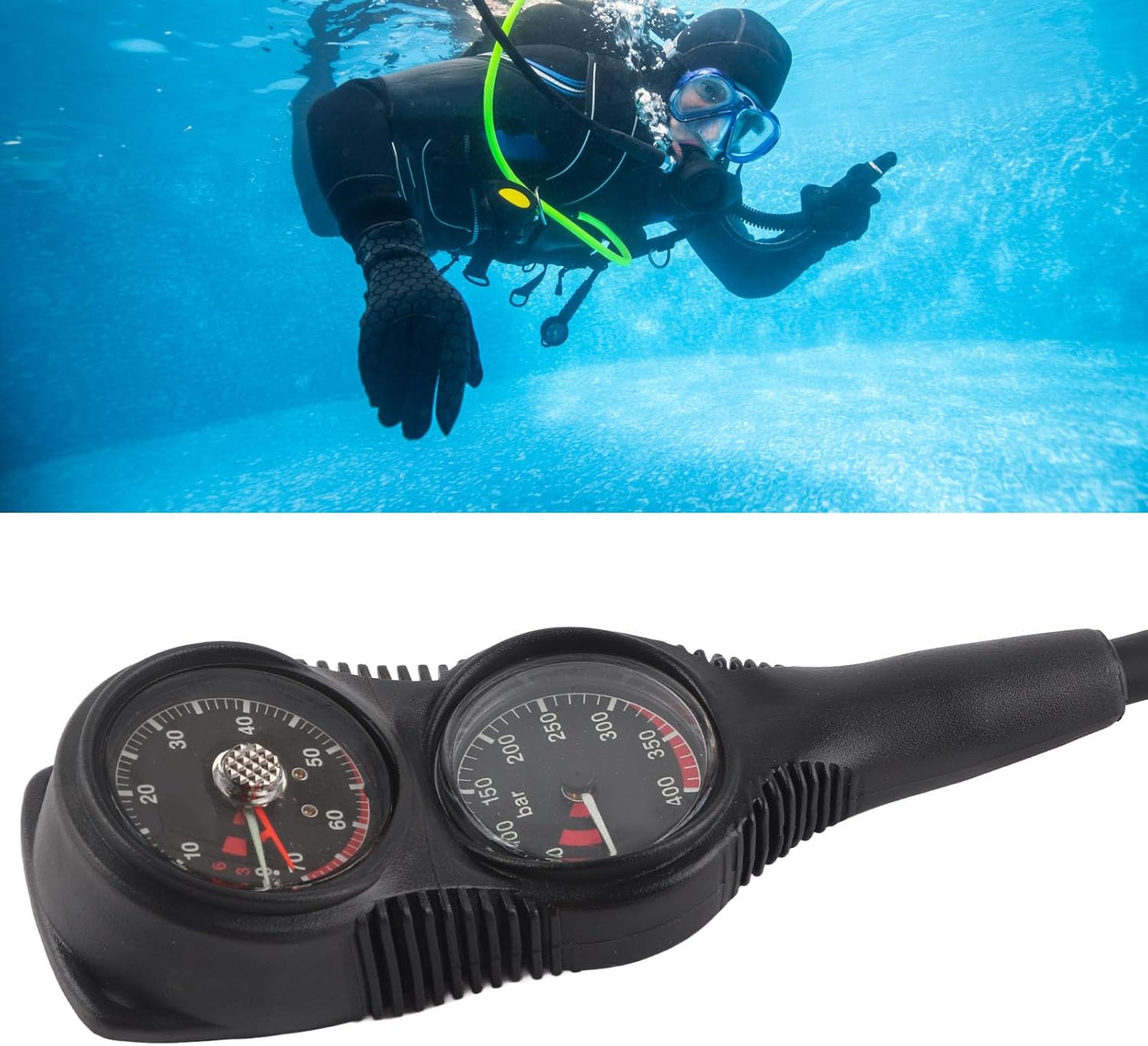 [ AND WATERPROOF DESIGN] Crafted from high-quality nylon and plastic materials, this scuba pressure gauge is built to withstand the rigors of underwater environments. Its waterproof, solid, and wear-resistant construction ensures long-lasting performance, making it a companion for all your diving adventures.[ACCURATE PRESSURE MEASUREMENT] The scuba pressure gauge is designed to measure the true pressure value with , providing divers with critical information about their oxygen levels. It also features a reminder function for the residual value of oxygen, ensuring you stay safe and informed during your dives.[ESSENTIAL DIVING EQUIPMENT] This professional-grade scuba pressure gauge is a must-have for any serious diver. Its robust design and advanced features make it an indispensable tool for monitoring your dive conditions, ensuring you have the necessary equipment for a safe and enjoyable underwater experience.[LUMINOUS DIAL FOR VISIBILITY] The dial of the scuba pressure gauge is equipped with luminous markers, allowing you to easily read the pressure values even in the darkest underwater conditions. This feature enhances safety by ensuring you can monitor your oxygen levels at all times, regardless of the lighting.[DUAL CONSOLE GAUGES] This scuba pressure gauge set includes two console gauges, with the pressure gauge capable of displaying readings up to 400 bar. The dual-gauge design provides comprehensive monitoring of your dive conditions, making it an essential tool for both recreational and professional divers.Spec:Features:Made of good quality materials, waterproof, solid, and wear-resistant.The scuba pressure gauge can measure the true pressure value and remind the diver of the residual value of oxygen.Professional necessary diving equipment.The dial is luminous, ensuring that the pressure value can be clearly seen in dark water.2 console gauges design. Pressure gauge showing up to 400