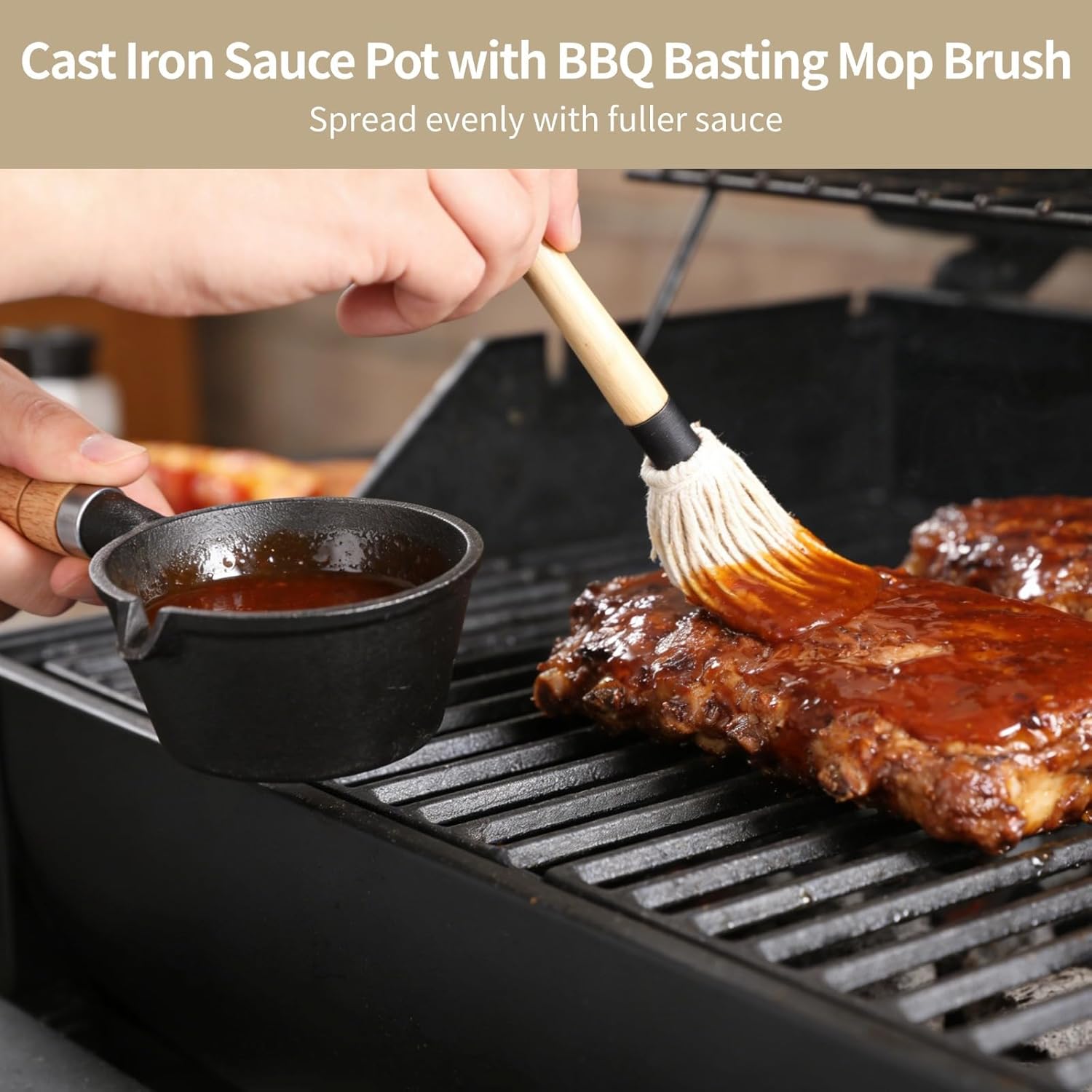 Color: Black Material: Cast Iron,Wood,Cotton,Stainless Steel,Plastic,Loofah Size: Cast Iron Pot: 4.3 x 2.4 in / 11 x 6 cm,Tongs: 11.6 x 2.7 in / 29.5 x 7 cm,Loofah Sponge: 4.3 x 2.8 in / 11 x 7 cm,Mop: 19.2 in / 49 cm,Mop Refill: 5.31 in / 13.5 cm Package Includes: 1 x Cast Iron Pot,1 x Pot Rack,1 x Mop,3 x Mop Refills,1 x Tongs, 2 x Loofah Sponges Note: - Please refer to the measurement. Tiny measuring error is allowable in normal range. - There might be a little color difference due to the monitor, camera or other factors, please refer to the physical item.