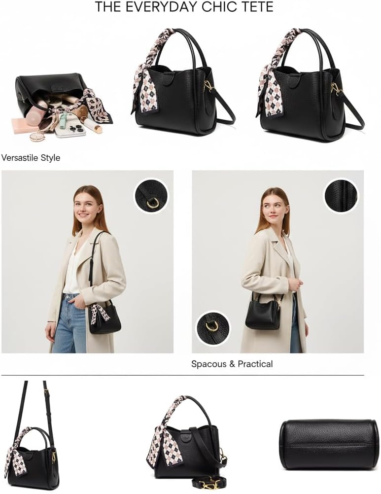 Crafted from high - quality genuine leather, this handbag features a luxurious texture and natural grain patterns. It’s durable enough for daily use and will develop a unique patina over time, aging gracefully while maintaining its charm. Distinctive Scarf Detailing The detachable plaid scarf tied around the handle is not just an accessory—it’s a statement. This elegant accent adds a touch of sophistication and visual flair, instantly elevating your look and making the bag stand out from mass - produced styles. Dual - Carry Flexibility With both an adjustable detachable shoulder strap(adorned with gold - toned hardware for a polished finish) and a comfortable top handle, you can easily switch between crossbody, shoulder, or handheld carry modes. Perfect for adapting to work, weekends, or evening outings. Spacious & Structured Design The roomy interior provides ample space for all your daily essentials—phones, wallets, cosmetics, and more. Despite its capacity, the bag holds its structured shape, combining practicality with a sleek silhouette. Timeless & Versatile Style The classic black hue pairs effortlessly with any outfit, from casual denim and T - shirts to formal dresses or workwear. Whether you’re heading to the office, a brunch date, or a night out, this bag is the ultimate versatile wardrobe staple. Refined Hardware Accents The gold - toned clasps and buckles aren’t just decorative—they ensure secure closure and fastening. These metallic details add a hint of luxury while enhancing the bag’s durability, blending style and functionality seamlessly.