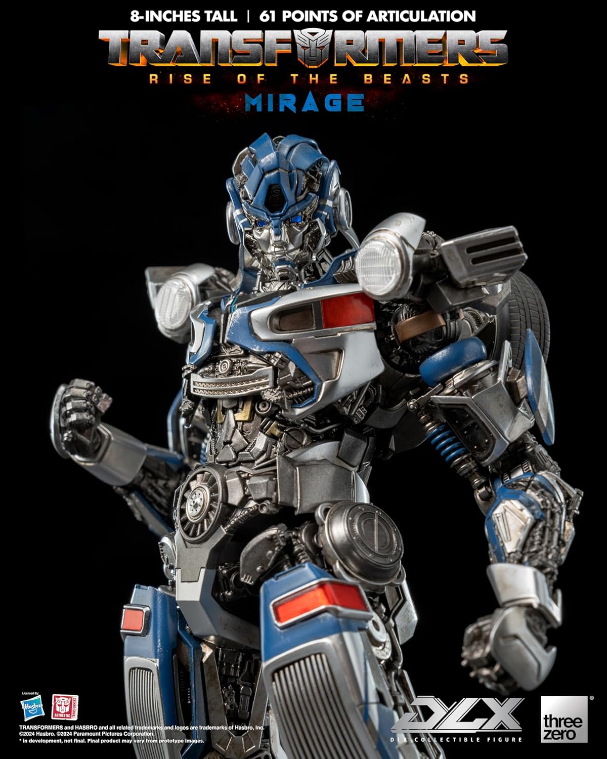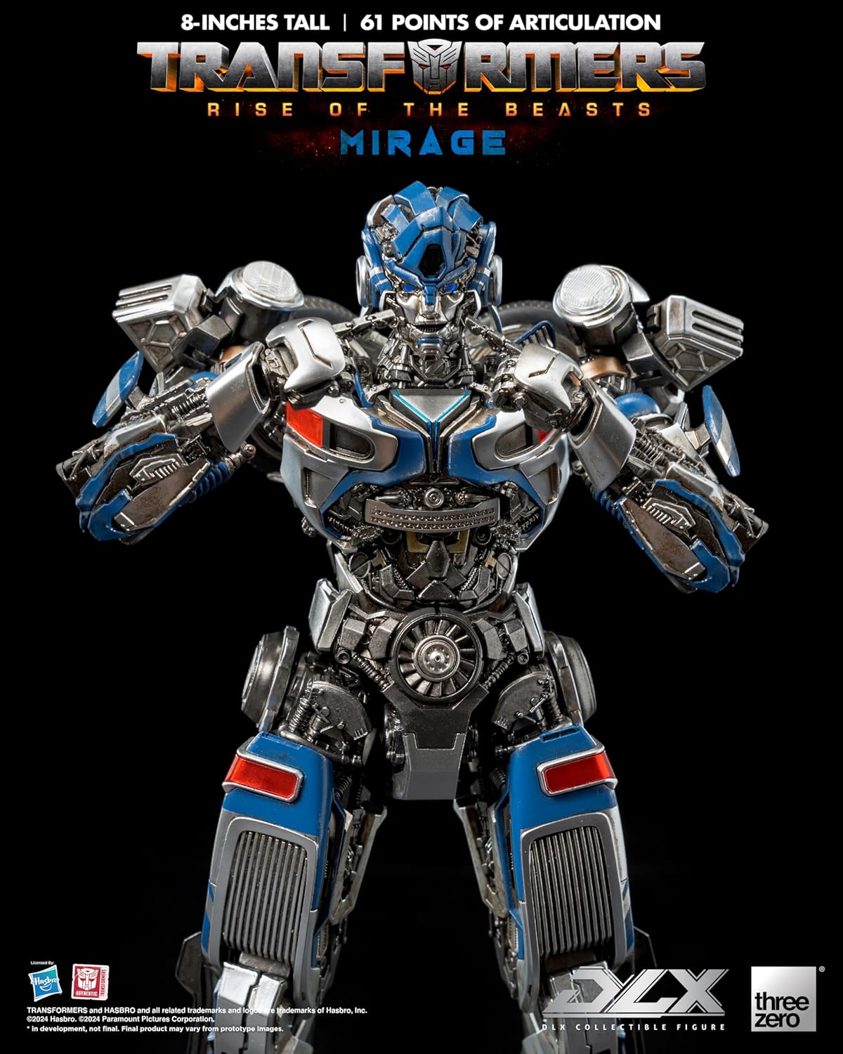 From threezero. Transformers: Rise of the Beasts DLX Mirage is a highly detailed and fully-articulated collectible figure of the fast-talking Autobot Mirage. This 8" (20.32 cm) tall figure boasts engineering grade plastics with a die-cast metal frame that provides enhanced durability and an incredible range of articulation, approximately 61 ponts, allowing for dynamic posing and display. The weathered paint application captures the battle-worn aesthetic of this heroic Autobot. Transformers: Rise of the Beasts DLX Mirage is threezeo's first ever DLX figure to incorporate magnetically controled LED lights*. The LED illuminated features installed in the eyes, Ion Blaster, chest, and shoulders, add an impressive level of realism and detail to the figure. An Autobot logo magnetic case is included that controls the LED lights functions by placing the magnet case close to where the LED lights are installed, turning them on and off. Other accessories include a pair of Ion Blasters, two interchangeable faceplates, offering both a smiling expression and a standard expression, and four pairs of interchangeable hands (fists, relaxed, action, and pointing). Additionally, DLX Mirage comes with a 4" (10.16 cm) tall figure of Noah Díaz in his Exo-Suit with approximately 12 points of articulation. The Exo-Suit Noah Díaz figure features several accessories including a pair of Exo-Suit Swords and a pair of Exo-Suit Ion Blasters, replicating the memorable scene in which an injured Mirage uses his body parts to convert into an Exo-Suit for Noah to fight alongside the Autobots.